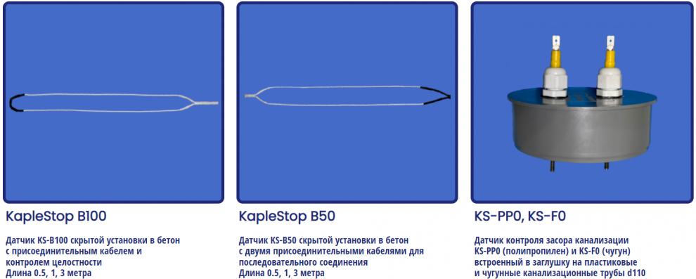 У KapleStop четыре вида датчиков. Три из них – линейные, представляющие собой витую пару проводов. Первый вид – конечный датчик. Именно он дал возможность понимать, как происходит намокание и высыхание, с его помощью разработчики стали различать конденсат и протечку.