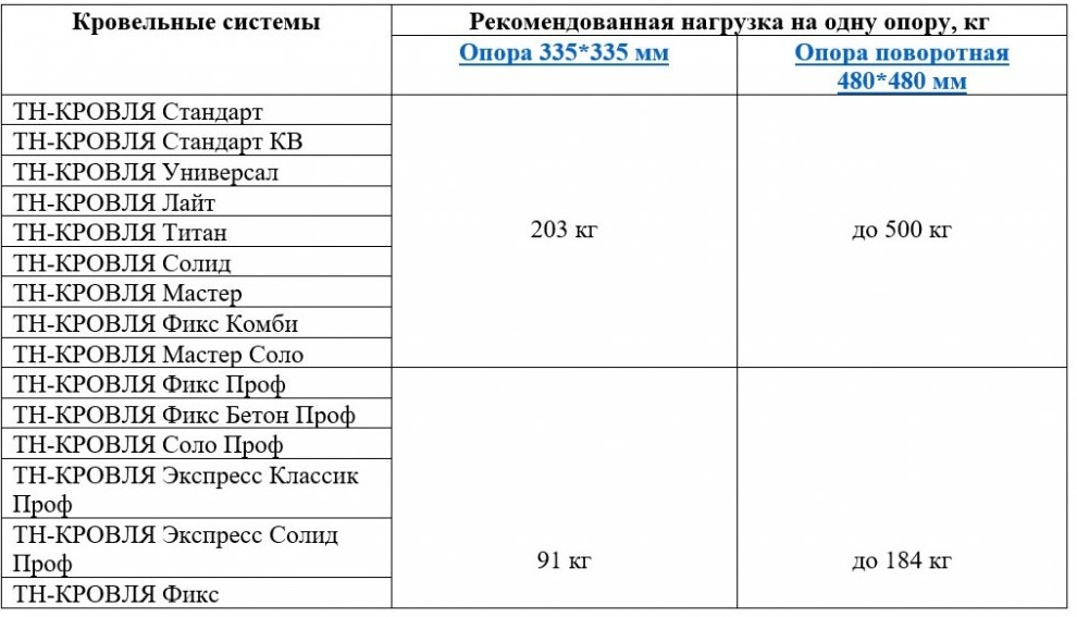В таблице приведены нагрузки на опоры в сочетании с кровельными системами ТЕХНОНИКОЛЬ:
