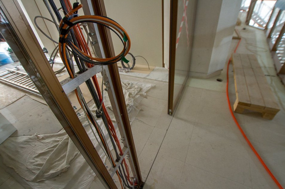 Вода, отопление, электроснабжение, освещение, компьютерные сети — все убрано под фальшпол. И уже на него уложены панели из сульфата кальция (смесь гипса с целлюлозой). Сверху все закрывает мрамор и паркет. Если, не дай Бог, на уровне коммуникаций, где-то что-то перемкнет и начнется пожар, плиты "отреагируют" таким образом, чтобы дым не проникал в помещение.