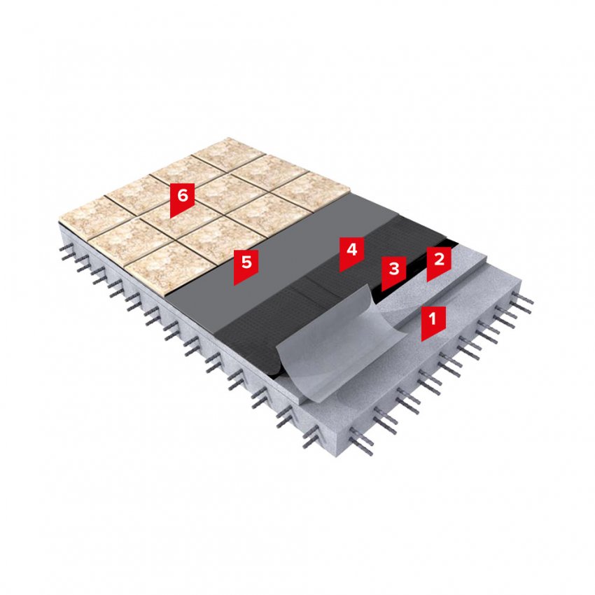 Следом укладывается ТЕХНОЭЛАСТ БАРЬЕР ЛАЙТ, поверх которого на плиточный клей укладывается половое покрытие из керамической плитки, керамогранита или натурального камня.