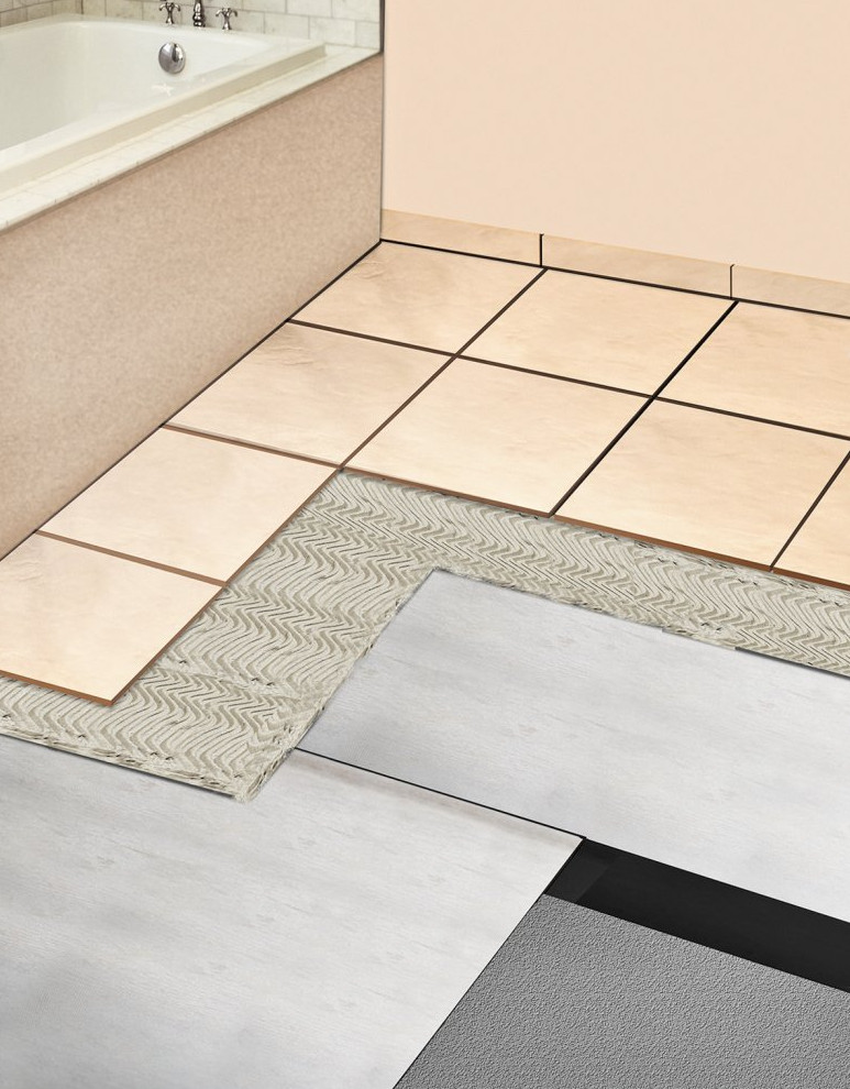 Во-вторых, прочность материала и защитное покрытие Spunbond позволяют исключить из устройства напольного покрытия трудоемкий «мокрый» процесс укладки цементно-песчаной стяжки. То есть плитку/керамогранит можно клеить непосредственно на материал. Это сокращает как затраты, так и время.