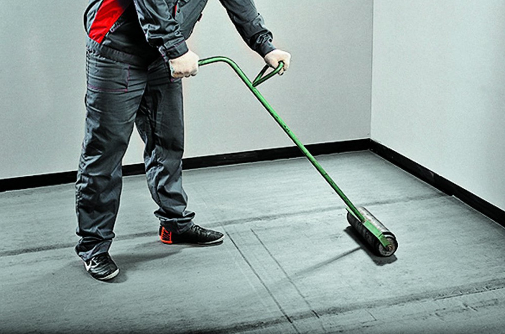 Сперва, если необходимо выровнять плоскость, закрыть неровности и щели, на перекрытии делается выравнивающий слой из цементно-песчаной стяжки. Высохшая поверхность очищается от мусора и пыли, после чего валиком или кистью наносится битумный праймер ТЕХНОНИКОЛЬ № 04, включая вертикальные поверхности – для эффективной адгезии клеящего слоя гидроизоляции с основанием и нижней частью стен.