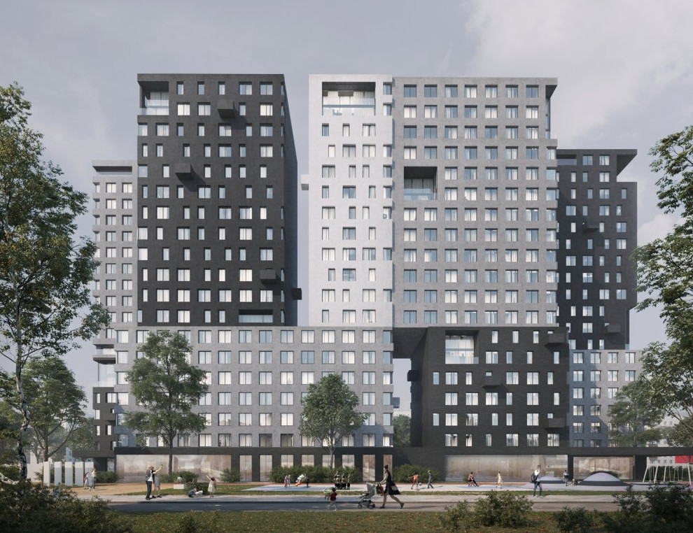 Фасад дома на Гражданской улице в Москве архитектурное бюро WALL решило сделать штукатурным, с добавлением клинкера