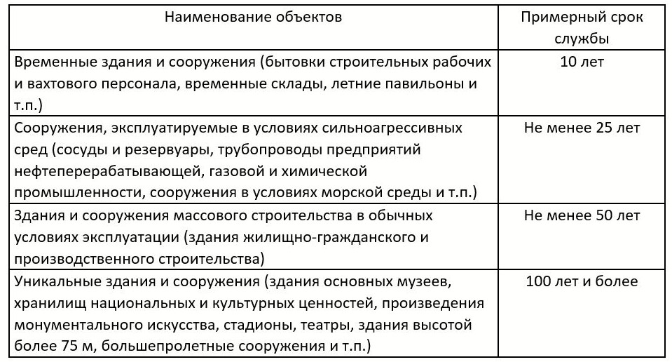 ГОСТ 27751: таблица с рекомендуемыми сроками службы зданий и сооружений: