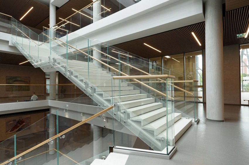 Отдельное направление — это исследования нашей лаборатории в области сверхпрочных бетонов. К примеру, из такого материала, эквивалентного по прочности стальным конструкциям, нами была изготовлена уникальная лестница в атриуме здания Хорошевской гимназии.