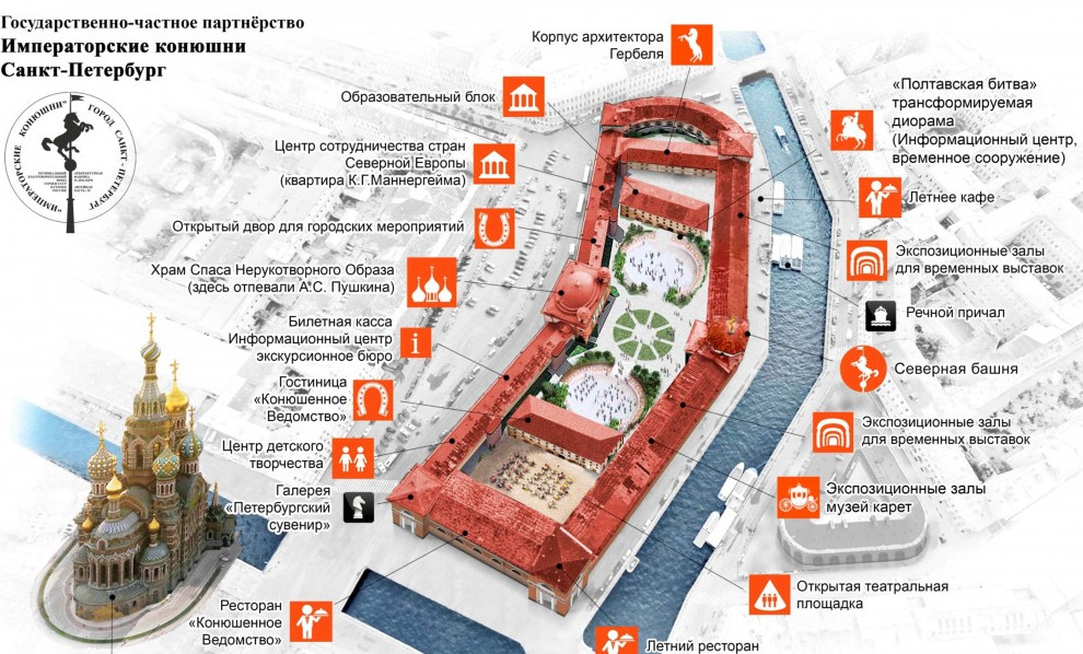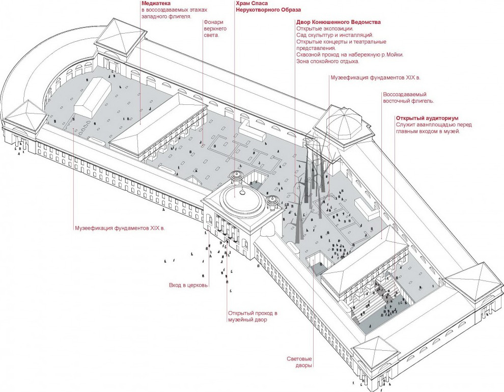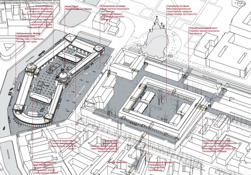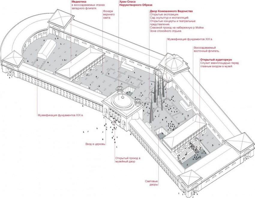 Главное отличие в том, что этот инвестор для экономической обоснованности проекта собирается заполучить еще и комплекс Конюшенного двора, расположенный на другой стороне Конюшенной площади. Там хотят «разобрать поздние пристройки и утилитарные диссонирующие постройки, искажающие первоначальный облик зданий» и насытить место культурной жизнью.